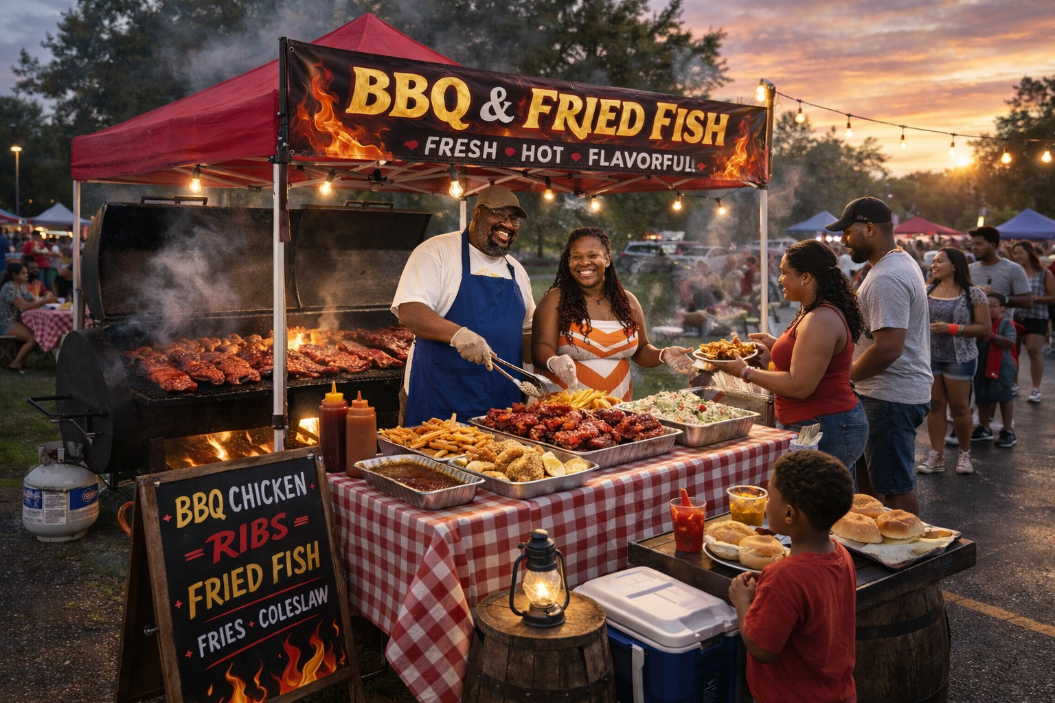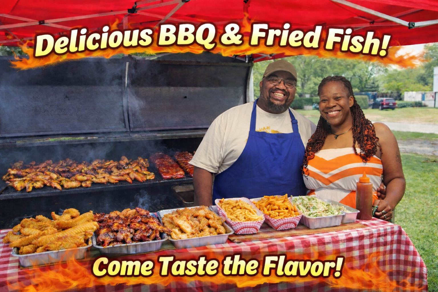 At Chosen307, we’re not just serving food; we’re dishing out happiness on a plate! Our pop-up food tent specializes in mouthwatering barbecue and comfort food that’ll make your taste buds dance. From our signature BBQ chicken to slow-cooked ribs slathered in our secret sauces, every bite is a flavor explosion. And let’s not forget our crispy, golden fried fish—made to order for that fresh-off-the-boat taste! Pair your meal with our seasoned fries and homemade coleslaw for a complete feast that’ll leave you grinning from ear to ear. Whether you catch us at a community event, festival, or your backyard bash, we’re here to serve up smiles and satisfaction!